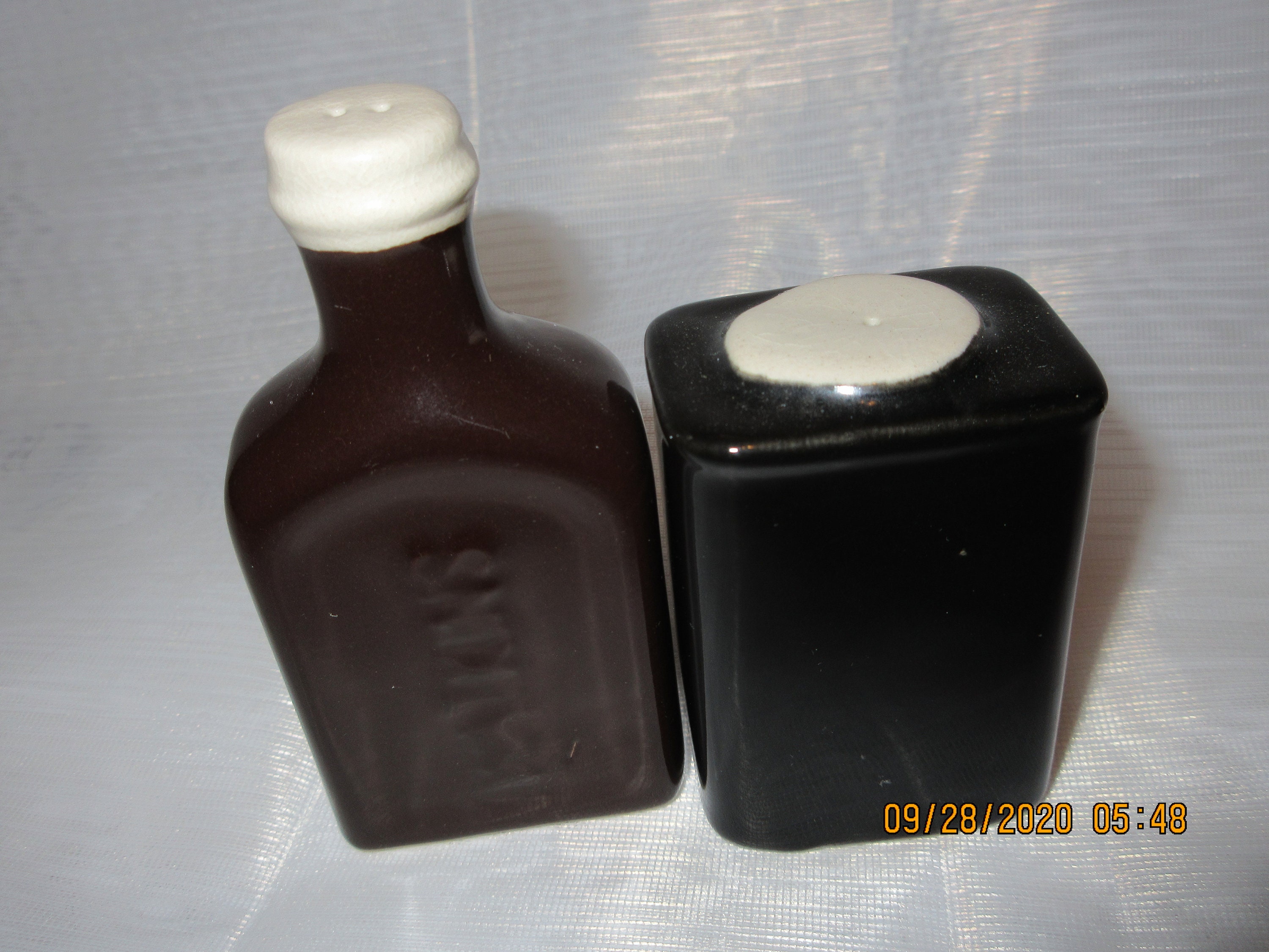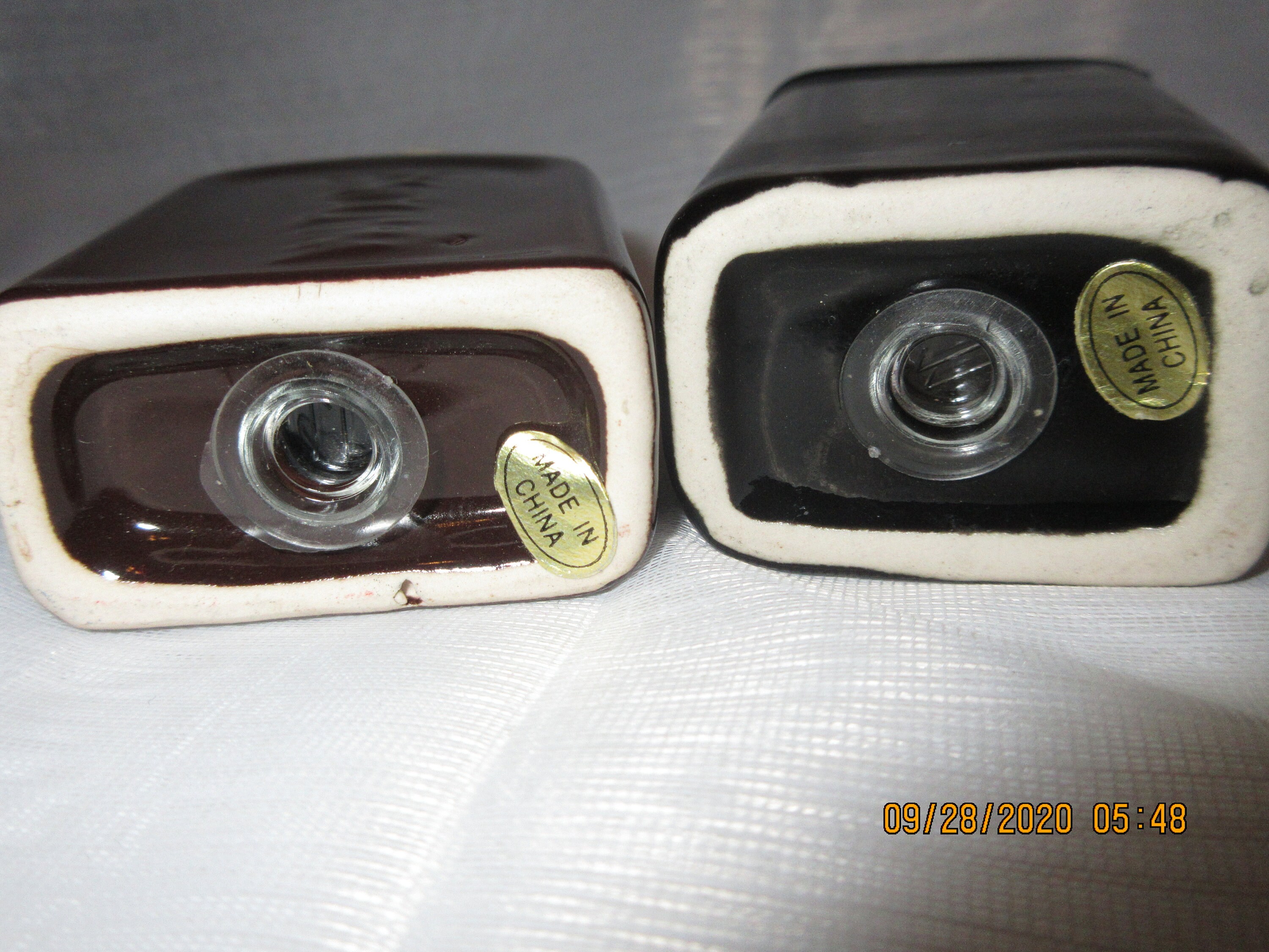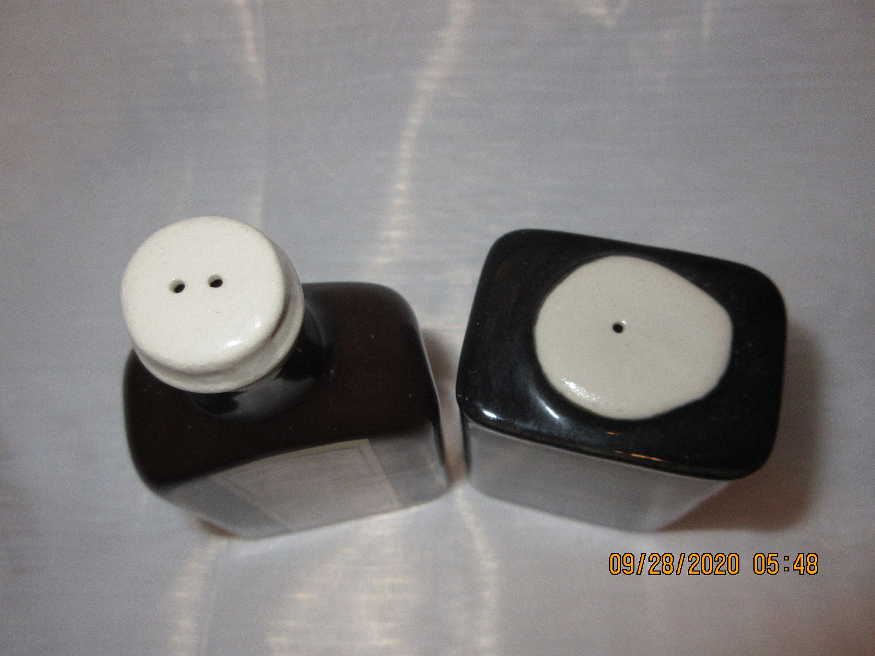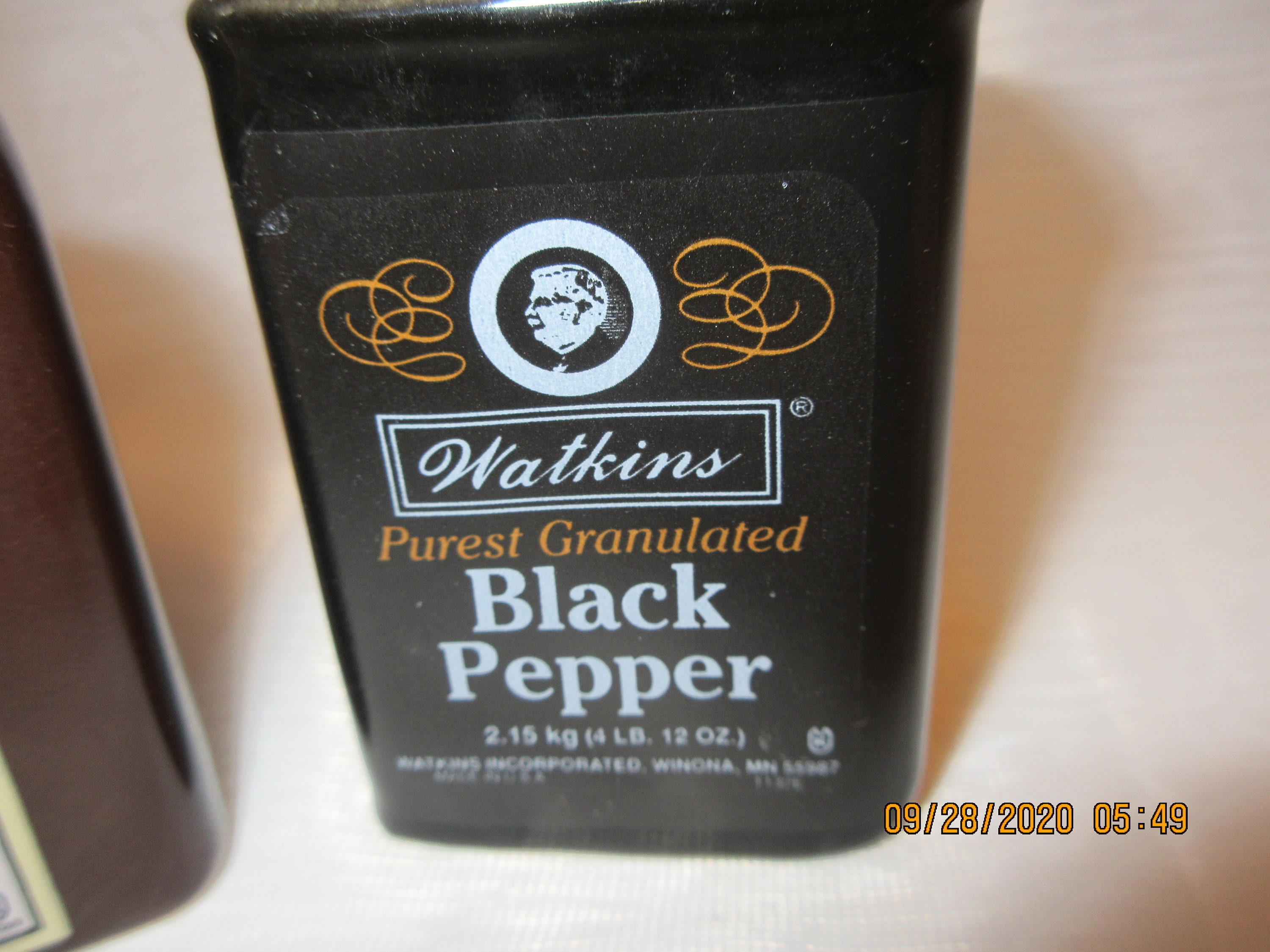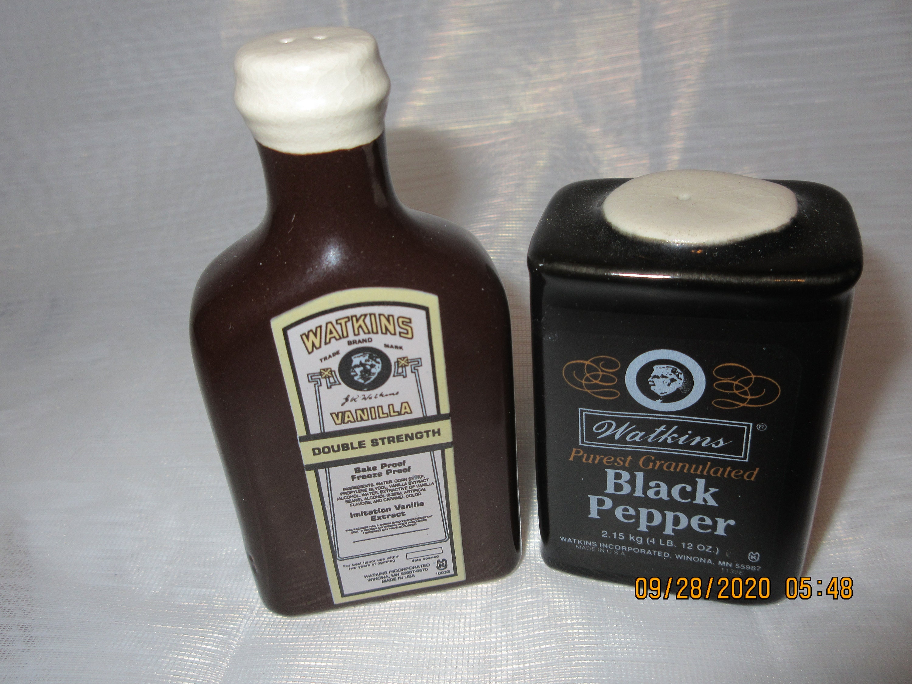 The black pepper shaker is black with Watkins printed on the front. It has a white top and is 2 1/2 inches tall. It has a plastic stopper and marked with a gold label "Made in China".