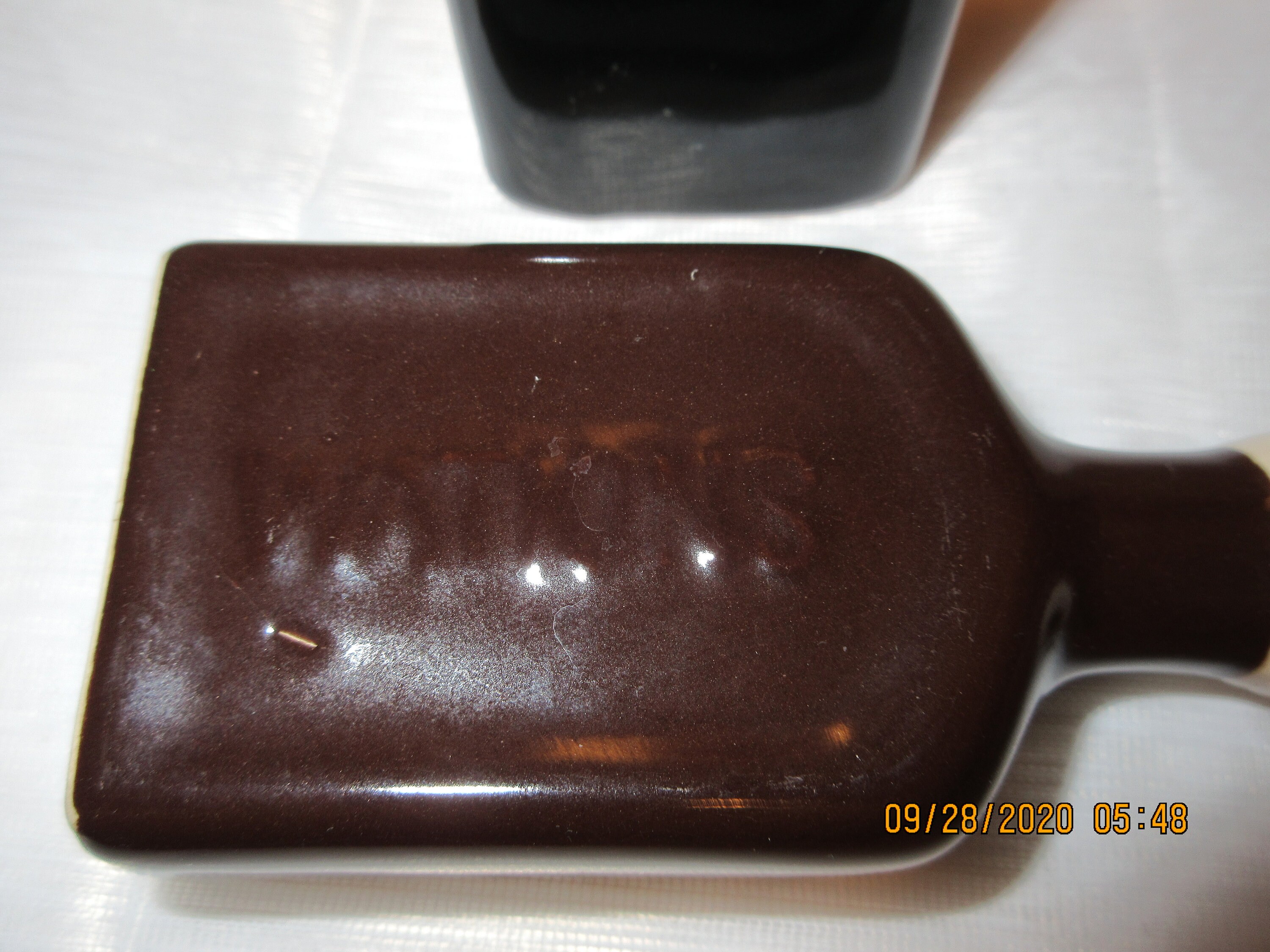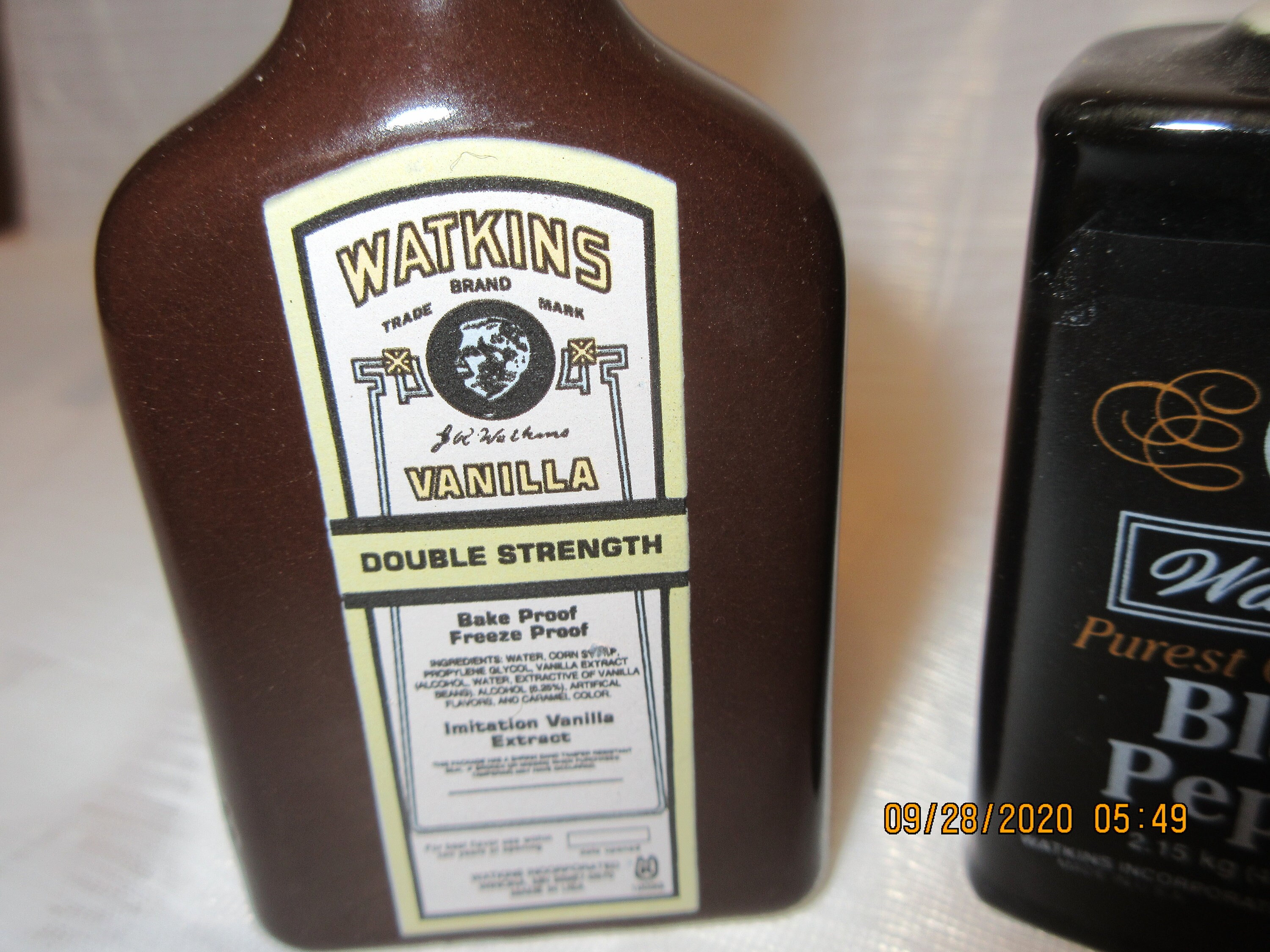 The Vanilla bottle is brown with a white top and the Watkins label on the front. This shaker is 3 1/2 inches tall, has a plastic stopper and marked the same as the other one.