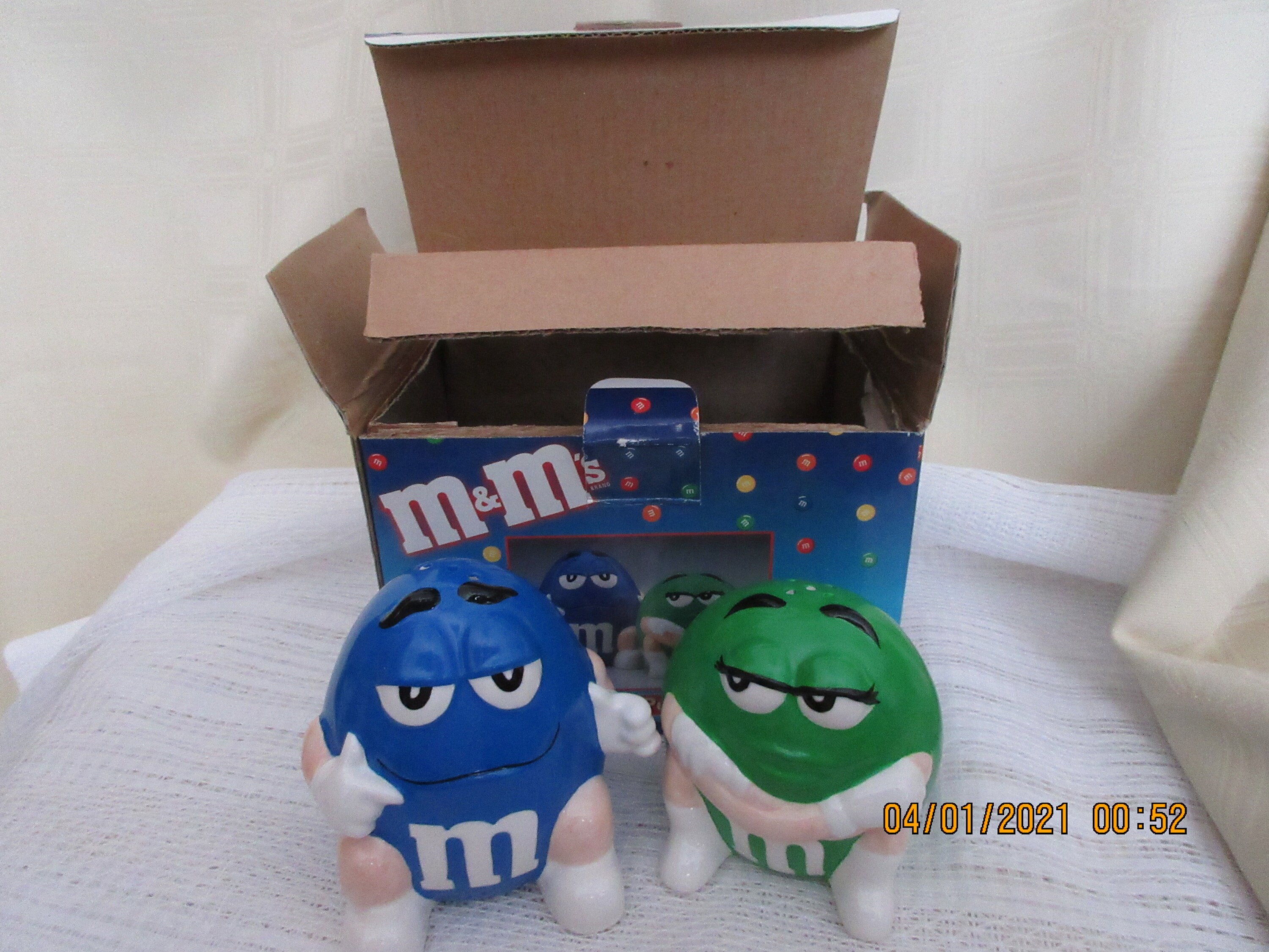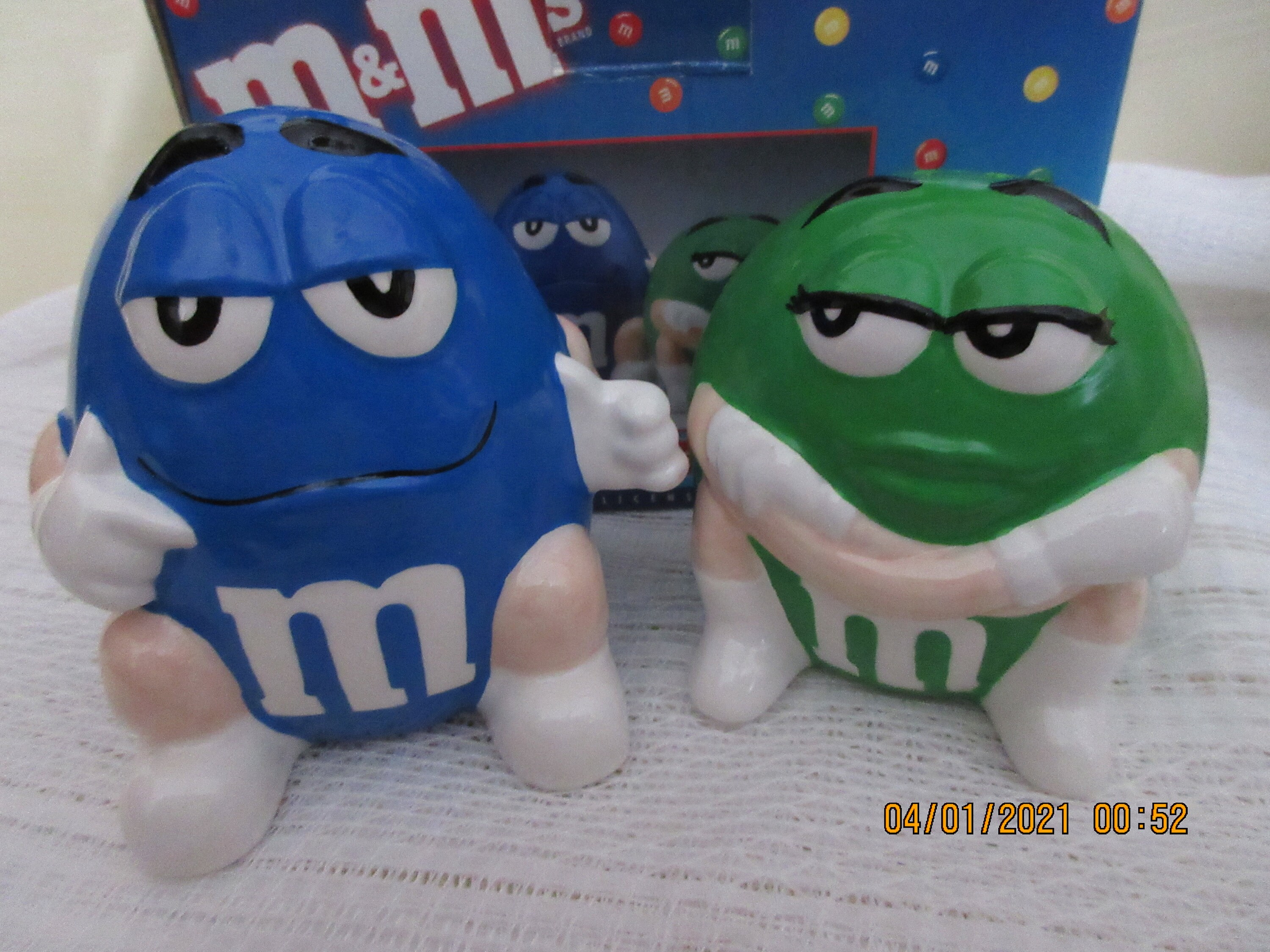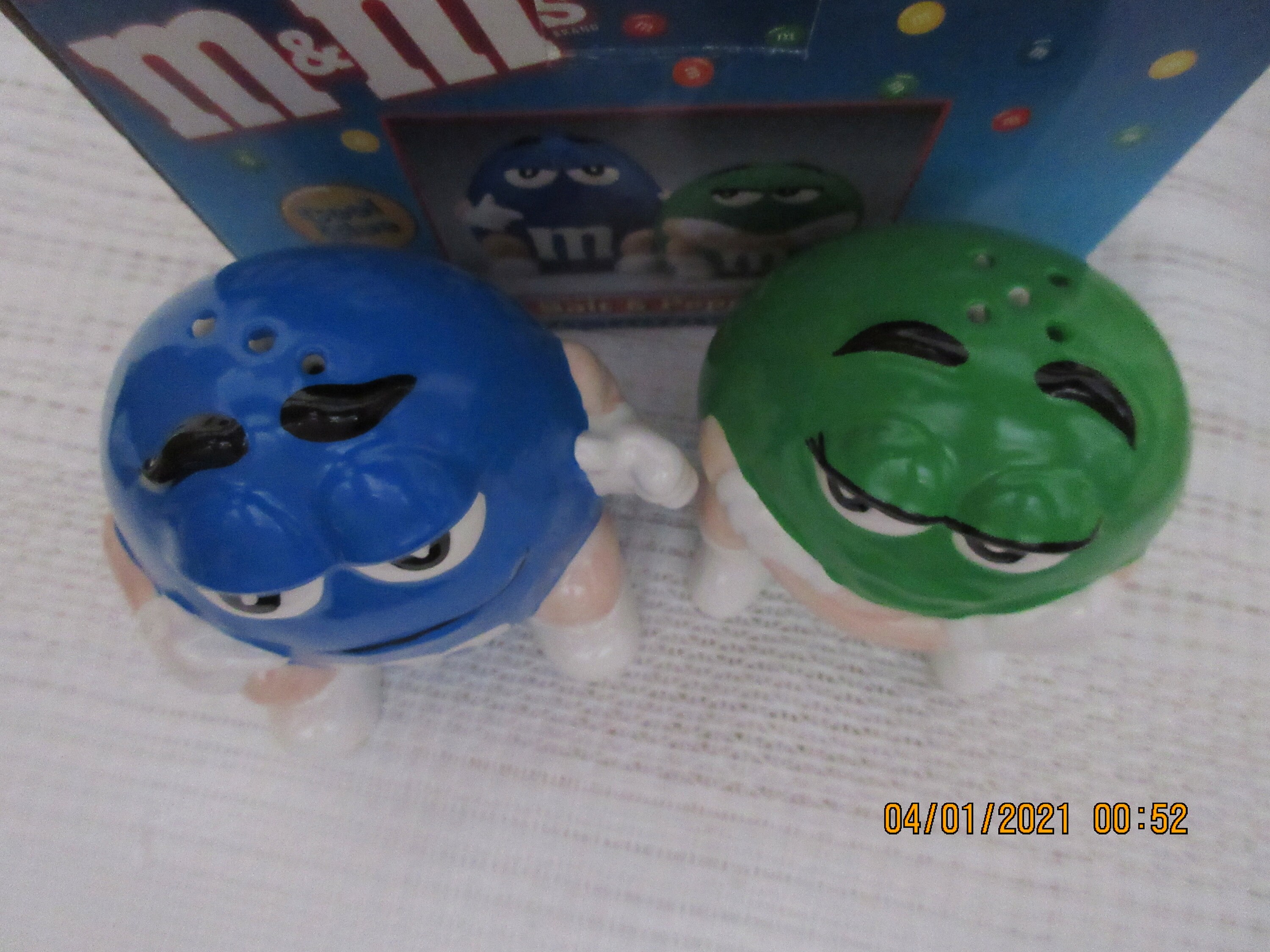 The green M&M has white eyes, black eyebrows, black eyelashes, white gloves and white shoes. It is sitting on the ground with it's arms crossed and has the letter "M" in white on the front. This shaker is 3 inches tall, has a plastic stopper and marked "® / TM. © Mars B&M Inc., N.Y. N.Y., Made in China".