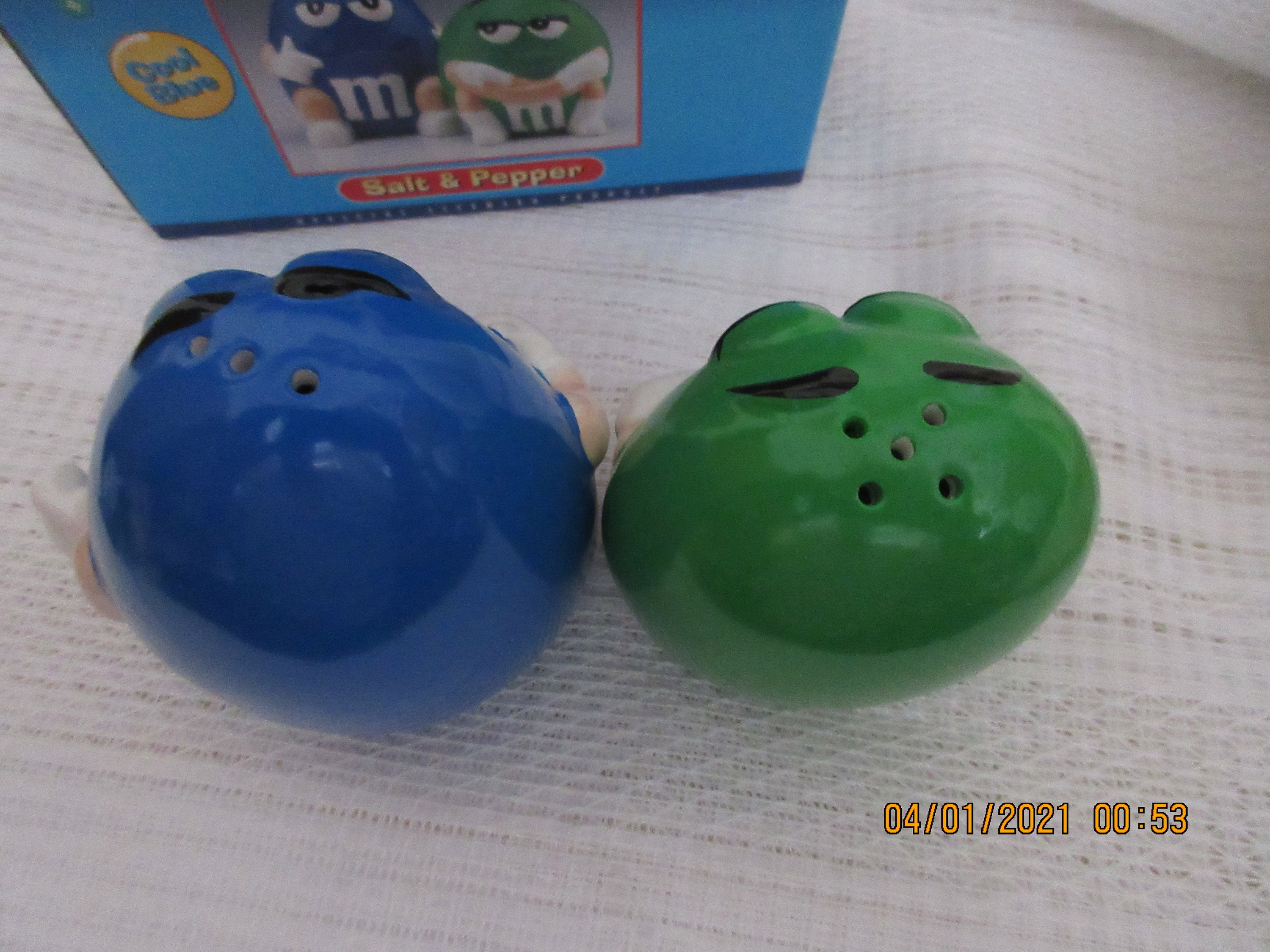 The blue M&M is also sitting on the ground. It has black eyebrows white eyes, is wearing white gloves and white shoes with a white M on the front. This shaker is marked the same as the green one. The shaker is 3 3/4 inches tall and has a plastic topper.
